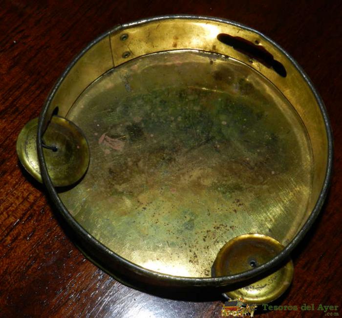 ANTIGUA PANDERETA DE HOJALATA LITOGRAFIADA CON MOTIVOS DE NIÑO JUGANDO, PRINCIPIOS DE SIGLO, MIDE 13,5 CMS. DE DIAMETRO, BUEN ESTADO DE CONSERVACION. LE FALTAN DOS PLATILLOS PEQUEÑITOS, FACILMENTE SUBSANABLE.