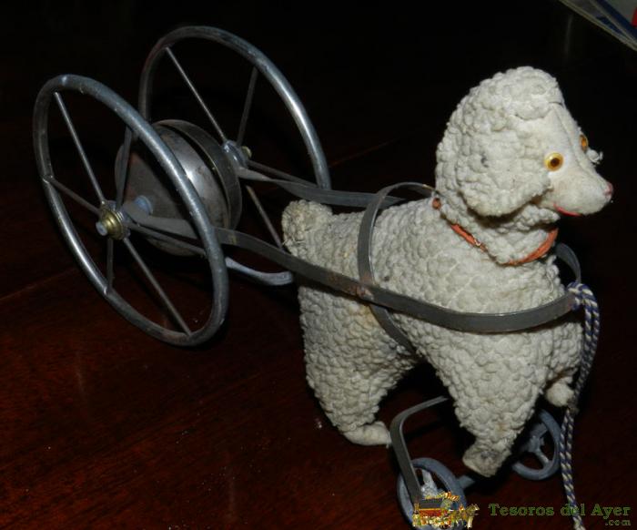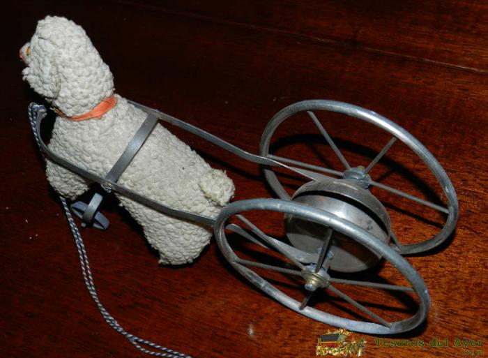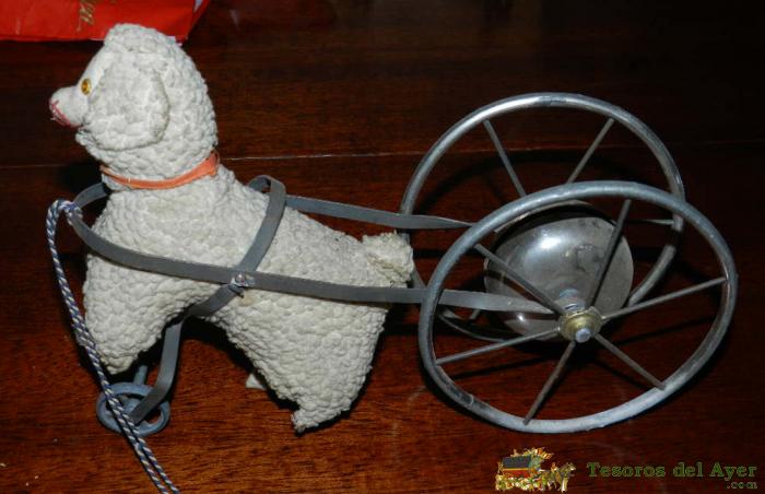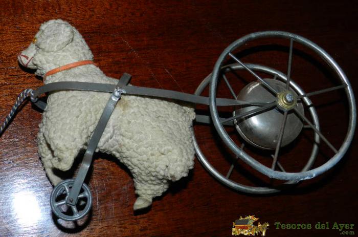 ANTIGUO JUGUETE ESPAÑOL ORIGINAL FINALES SIGLO XIX PRINCIPIOS DEL XX CARRO METALICO CON RUEDAS Y CON CAMPANA METALICA TIRADO POR CORDERO DE TEJIDO TRABAJADO IMITANDO LANA, MIDE 27 CMS. DE LONGITUD