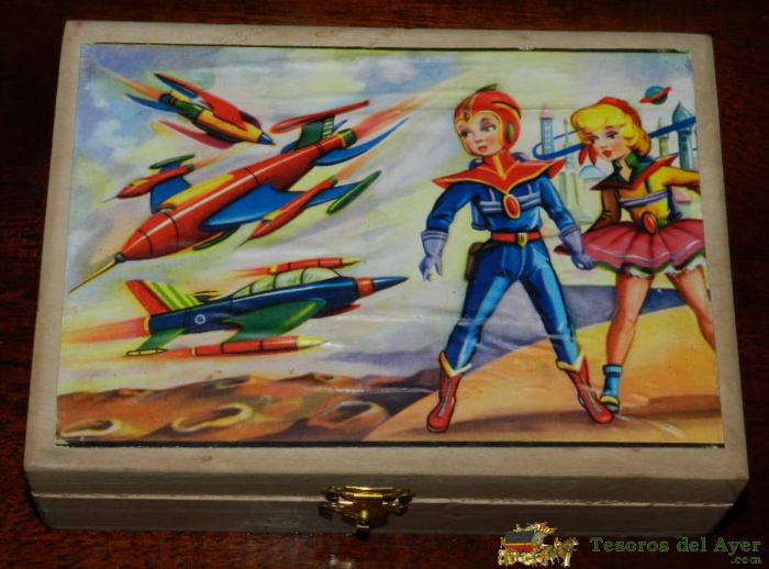 ANTIGUA CAJA DE LABORES PARA NIÑA, AÑOS 40 O 50, DE MADERA, COMPLETO TAL COMO SE VE EN LAS FOTOGRAFIAS PUESTAS, MIDE 15 X 12 X 4 CMS. CON MOTIVO DE CIENCIA FICCION, COHETE, MARTE ETC...