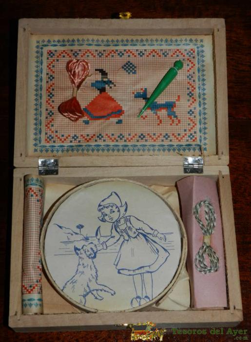 ANTIGUA CAJA DE LABORES PARA NIÑA, AÑOS 40 O 50, DE MADERA, COMPLETO TAL COMO SE VE EN LAS FOTOGRAFIAS PUESTAS, MIDE 16 X 11,5 X 4 CMS. CON MOTIVOS MARINEROS ETC...