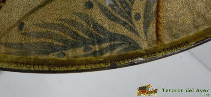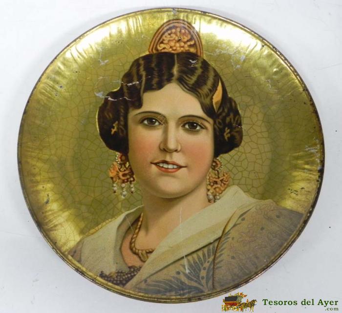 ANTIGUO PLATO GRANDE DE HOJALATA LITOGRAFIADA CON BUSTO DE VALENCIANA, SOCIETE GENERALE DES CIRAGES FRANCAIS, SANTANDER, MUY GRANDE 40 CMS. DE DIAMETRO, TAL COMO SE VE EN LAS FOTOGRAFIAS PUESTAS.