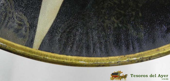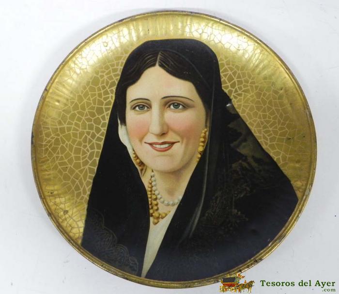 ANTIGUO PLATO GRANDE DE HOJALATA LITOGRAFIADA CON MUJER DE PIEDRAHITA (AVILA), SOCIETE GENERALE DES CIRAGES FRANCAIS, SANTANDER, MUY GRANDE 40 CMS. DE DIAMETRO, TAL COMO SE VE EN LAS FOTOGRAFIAS PUESTAS.