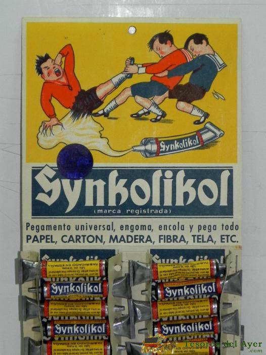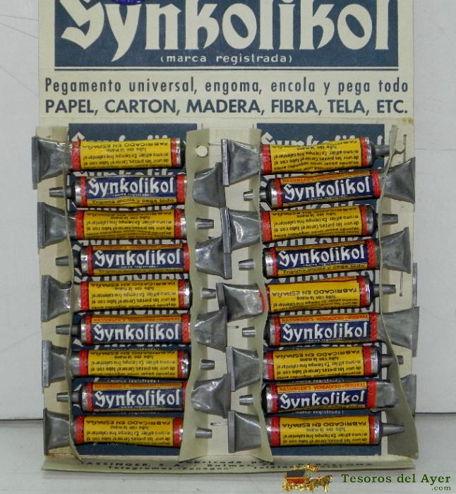 DISPENSADOR PEGAMENTO SYNKOLIKOL, BARCELONA, AñOS 50. DISPLAY-DISPENSADOR DEL PRODUCTO SYNKOLIKOL, DE LOS AñOS 50. MIDE 36 X 16 CM. , TIENE 18 TUBOS DE PEGAMENTO, PEGAMENTO UNIVERSAL, ENGOMA, ENCOLA Y PEGA TODO. PAPEL, CARTON, MADERA, FIBRA, TELA, ETC. MI