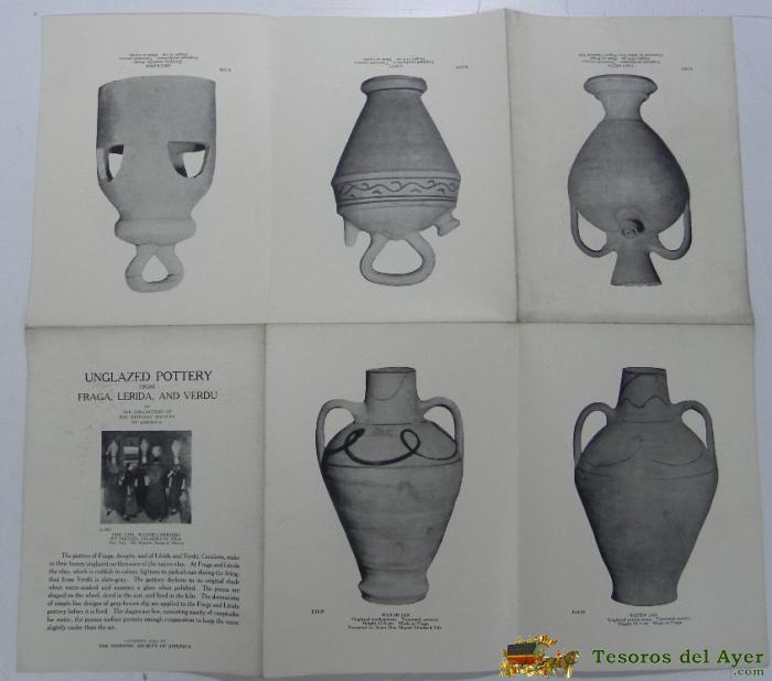 UNGLAZED POTTERY FROM FRAGA, LERIDA, AND VERDU IN THE COLLECTIN OF THE HISPANIC SOCIETY OF AMERICA WITH COMPARATIVE MATERIAL, 1930, 12 PAGINAS, SE DESPLIEGA EN CARTEL, CADA PAGINA MIDE 19 X 14 CMS. MUY ILUSTRADO, CERCAMICA, PORCELANA.