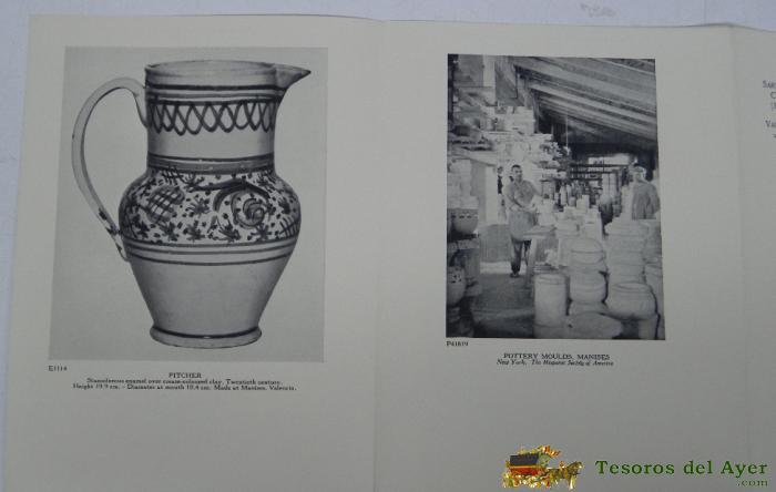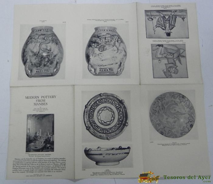 MODERN POTTERY FROM MANISES IN THE COLLECTIN OF THE HISPANIC SOCIETY OF AMERICA WITH COMPARATIVE MATERIAL, 1930, 12 PAGINAS, SE DESPLIEGA EN CARTEL, CADA PAGINA MIDE 19 X 14 CMS. MUY ILUSTRADO, CERCAMICA, PORCELANA.