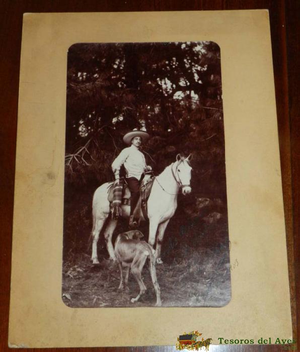ANTIGUA FOTOGRAFIA ALBUMINA DE MORELOS, 1903, CUERNAVACA (MEXICO) DIRIGENTE DE LA HACIENDA DE SAN VICENTE A CABALLO, FIRMADA SEBASTIAN, MIDE 25,5 X 19,5 CMS. INCLUYENDO EL PASPARTOUT, EXCEPCIONAL. OLD PHOTOGRAPH OF ALBUMIN MORELOS, 1903, CUERNAVACA (MEXICO) LEADER OF THE TREASURY OF SAN VICENTE A HORSE, SIGNED SEBASTIAN, MEASURES 25.5 X 19.5 CMS. INCLUDING TOUT, EXCEPTIONAL.