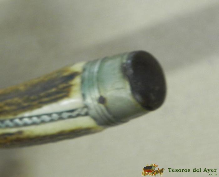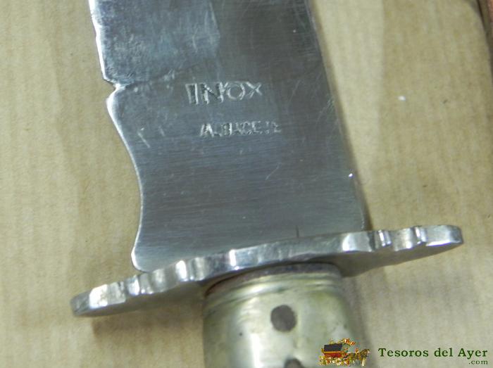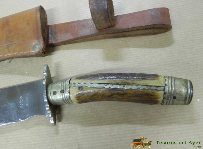 ANTIGUO MACHETE DE CAZA, INOX ALBACETE CON EMPUÑADURA DE ASTA CON FILIGRANA METALICA, FUNDA DE CUERO, MIDE 26 CMS