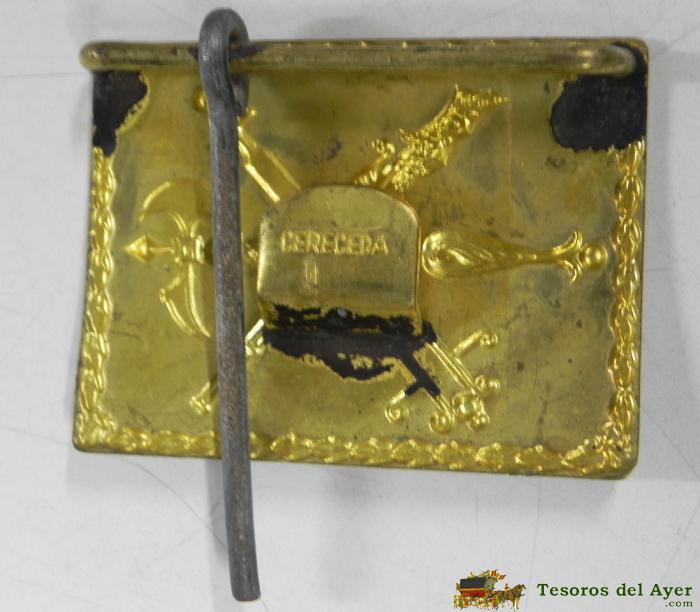 ANTIGUA HEBILLA MILITAR DE LEGIÓN ESPAÑOLA, ESCUDO LEGIONARIO CON CORONA, DORADA Y MARCADA POR EL REVERSO CERECEDA, MIDE 6 X 4,5 CMS.