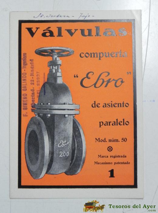 CATáLOGO DE VALVULAS COMPUERTA EBRO, MODELO NUM. 50, DE LAS FUNDICIONES EBRO (ZARAGOZA), TRIPTICO CON LAS CARACTERISTICAS, DE LAS DISTINTAS VALVULAS, MIDE ABIERTO 32 X 15 CMS.