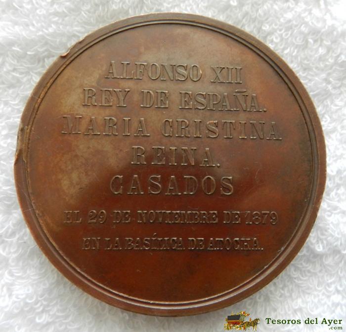 MEDALLA DE BRONCE BODA ALFONSO XII Y Mª CRISTINA, G. SELLAN F. 1879, ALFONSO XII REY DE ESPAÑA MARIA CRISTINA REINA, CASADOS EL 29 DE NOVIEMBRE DE 1879 EN LA BASILICA DE ATOCHA, ALGUN LIGERO GOLPE EN EL CANTO, TAL COMO SE PUEDE VER EN LAS FOTOS PUESTAS,