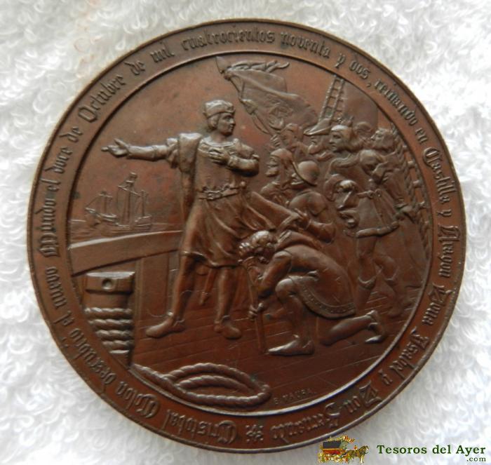 MEDALLA DE BRONCE 1892 - CUARTO CENTENARIO DEL DESCUBRIMIENTO DE AMÉRICA - GRABADOR B. MAURA, MIDE 7 CMS. DE DIAMETRO, PESA 176 GRAMOS, COMPLETAMENTE ORIGINAL, MEDALLA IMPORTANTE, VER LAS FOTOS QUE HEMOS PUESTO. BUEN ESTADO DE CONSERVACION.