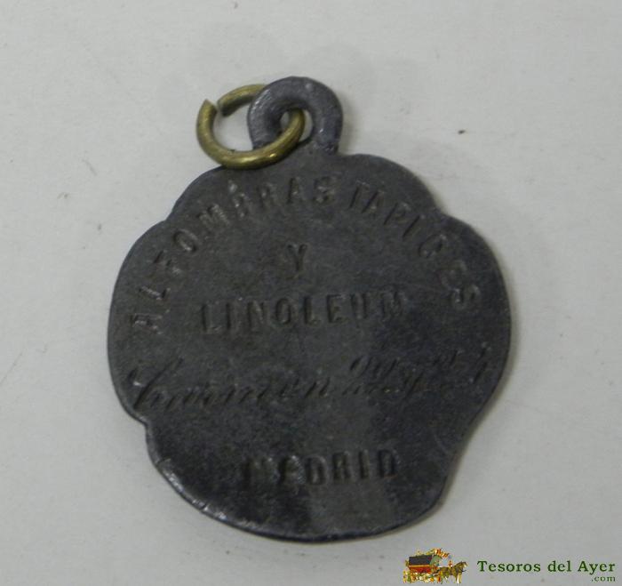 ANTGUA MEDALLITA ALFONSO XIII CON PUBLICIDAD DE ALFOMBRAS TAPICES Y LINOLEUM, CALLE CARMEN 22 Y 24 DE MADRID, MIDE 2,9 X 2,5 CMS.
