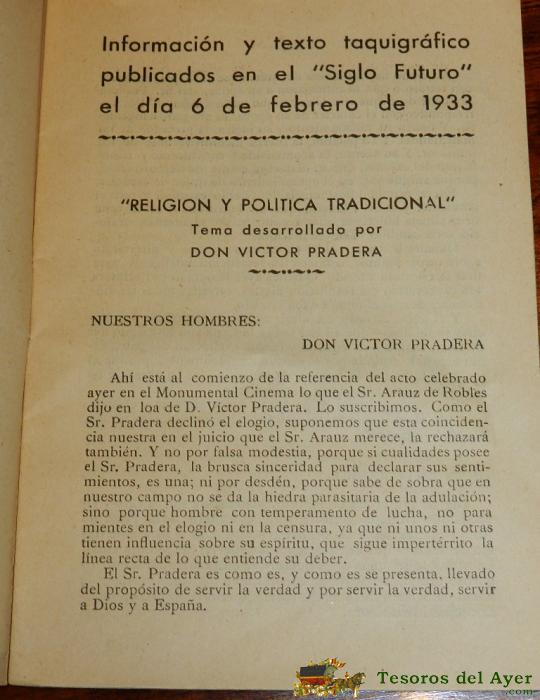 CONFERENCIA TRADICIONALISTA DE VICTOR PRADERA 1933. CARLISMO, REPUBLICA EN FEBRERO DE 1933 EN EL MONUMENTAL CINEMA, 32 PQGINAS Y MIDE 17 X 12 CMS.