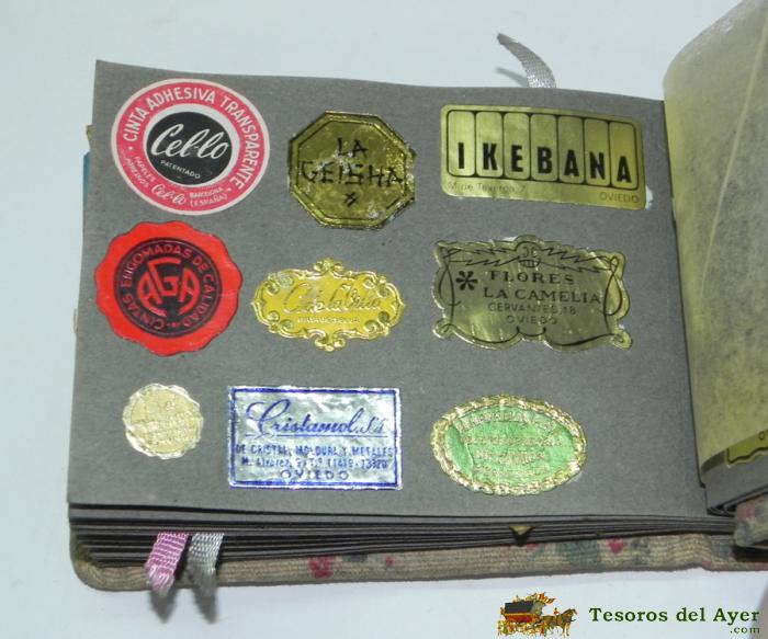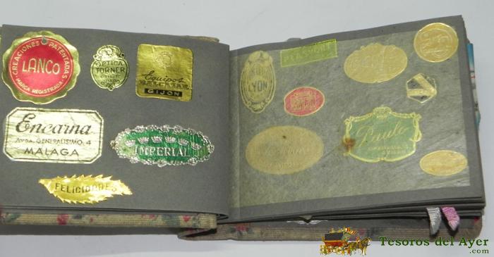 ANTIGUO ALBUM CATÁLOGO CON ETIQUETAS DE PERFUMERIA, JOYERIA, VINOS, HOTELES, CONFITERIA, ETC..., 18 HOJAS CON MAS DE 150 ETIQUETAS PEGADAS DE DISTINTOS TAMAÑOS. MIDE 15 X 10 CMS.