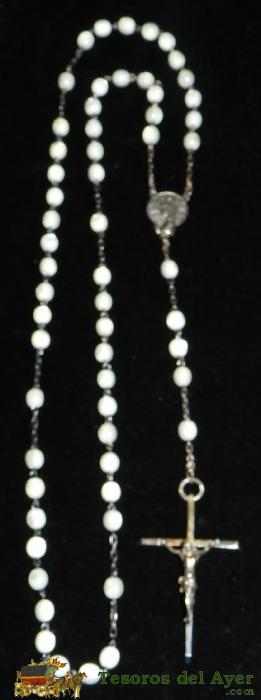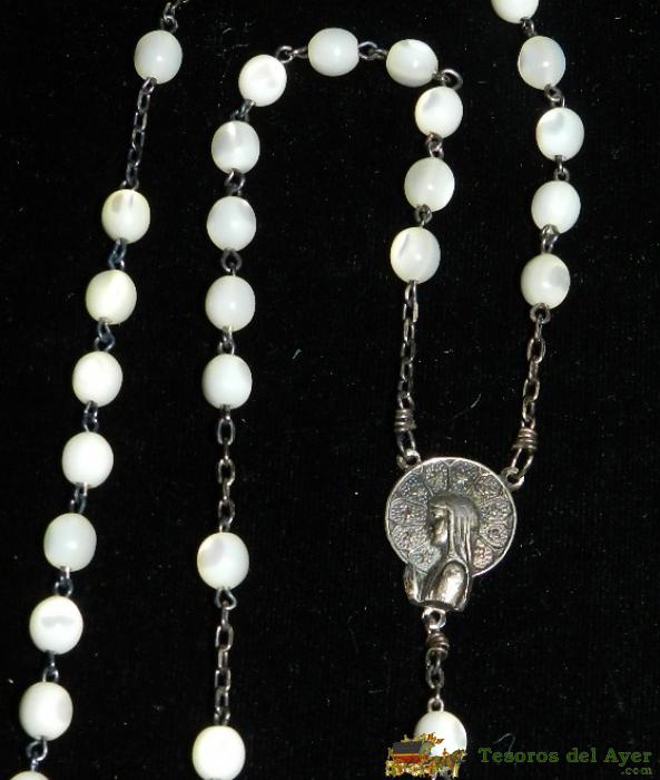 ANTIGUO ROSARIO DE PLATA Y NACAR, EXCEPCIONAL, MODERNISTA, FINALES DEL SIGLO XIX, MIDE 53 CMS. DE LONGITUD INCLUIDO EL CRUCIFIJO. PRECIOSO