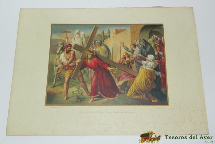 ANTIGUA LITOGRAFIA DEL ENCUENTRO DE JESUS Y MARIA YENDO AL CALVARIO, LITOGRAFIA LABIELLE, M. PUJADAS, PRECIOSA MIDE 38,5 X 27,5 CMS.