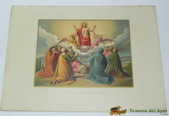 ANTIGUA LITOGRAFIA DE LA ASCENSION DE JESUS A VISTA DE MARIA Y LOS DISCIPULOS, LITOGRAFIA LABIELLE, M. PUJADAS, PRECIOSA MIDE 38,5 X 27,5 CMS.