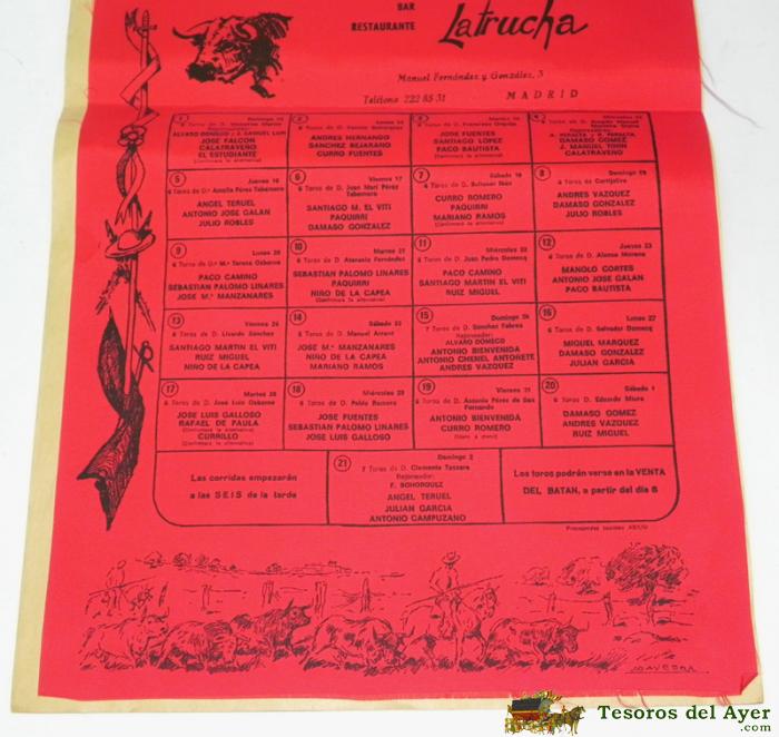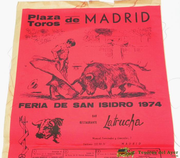 ANTIGUO CARTEL DE TOROS EN MADRID, FERIA DE SAN ISIDRO DE 1974, CON PUBLICIDAD DE BAR LA TRUCHA, ILUSTRADO POR SAAVEDRA, MIDE 50 X 26 CMS, EN SEDA PEGADO SOBRE PAPEL.