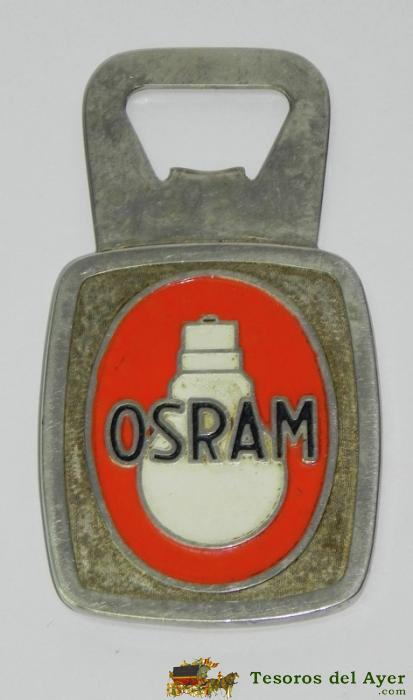 ANTIGUO ABREBOTELLAS METALICO CON PUBLICIDAD DE BOMBILLAS OSRAM, MIDE 9,8 CMS.