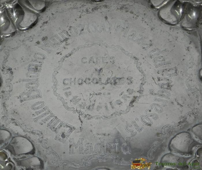ANTIGUA BANDEJA METALICA CON PUBLICIDAD DE CAFES Y CHOCOLATES MARCA LA MADRILEÑA, EMILO BOLONIO MUÑOZ, PLAZA DEL PROGRESO, 13 DE MADRID, MIDE 25 CMS. DE DIAMETRO. FINALES SIGLO XIX PRINCIPIOS DEL XX.
