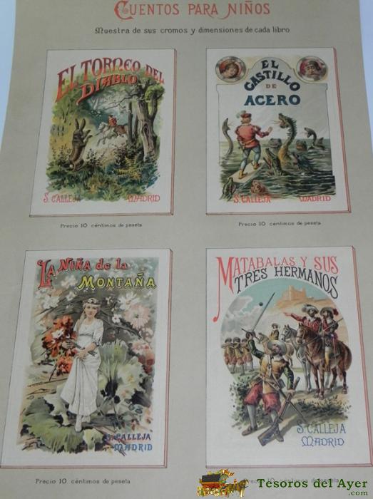 ANTIGUO CARTEL CON PUBLICIDAD DE LOS CUENTOS DE CALLEJA, CUENTOS PARA NIÑOS - COMPLEAMENTE ANTIGUO Y ORIGINAL - MUESTRA DE SUS CROMOS Y DIMENSIONES DE CADA LIBRO, POR LA PARTE TRASERA VA TAMBIEN IMPRESO, SEGURAMENTE SE PONIAN EN LAS ANTIGUAS LIBRERIAS. MIDE 29.5 X 43 CMS. PRINCIPIOS DEL SIGLO XX,