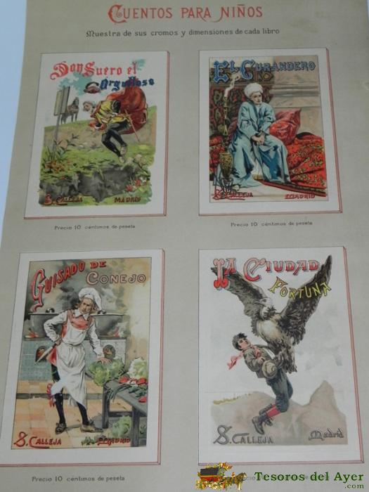 ANTIGUO CARTEL CON PUBLICIDAD DE LOS CUENTOS DE CALLEJA, CUENTOS PARA NIÑOS - COMPLEAMENTE ANTIGUO Y ORIGINAL - MUESTRA DE SUS CROMOS Y DIMENSIONES DE CADA LIBRO, POR LA PARTE TRASERA VA TAMBIEN IMPRESO, SEGURAMENTE SE PONIAN EN LAS ANTIGUAS LIBRERIAS. MIDE 29.5 X 43 CMS. PRINCIPIOS DEL SIGLO XX,