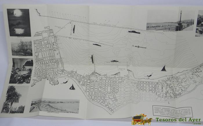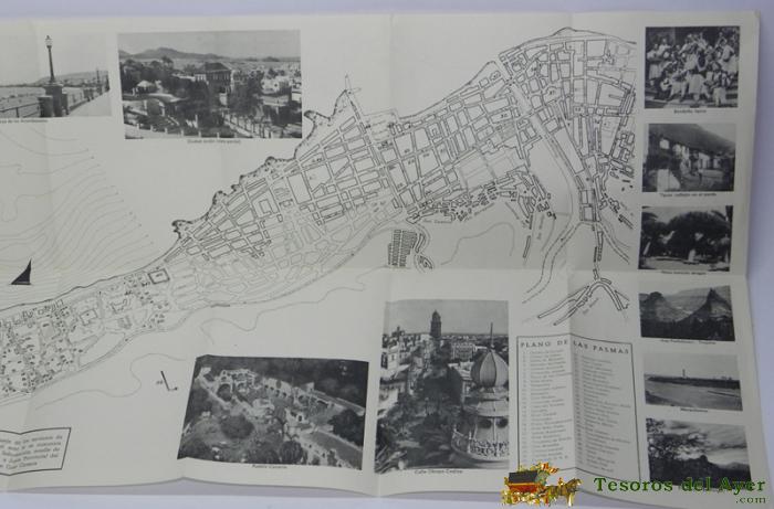 ANTIGUO FOLLETO TURISMO LAS PALMAS DE GRAN CANARIA. APROX 1940. JUNTA PROVINCIAL DE TURISMO, POR UN LADO EL PLANO CON FOTOS EN NEGRO, POR EL OTRO, INFORMACIóN TURíSTICA: MONUMENTOS, MUSEOS, PLAYAS, RESTORANES, CAFES Y BARES, CAMPO DE GOLF, CAMPOS DE TENIS, ESPECTACULO PúBLICOS, CUERPO CONSULAR, CALLES, PASAPORTES, AGENCIA VIAJES, AGUAS MINERALES Y MINERO MEDICINALES, PUEBLOS, ETC. CON PEQUEñO PLANO DE TODA LA ISLA Y DOS ILUSTRACIONES. MIDE DESPLEGADO 95 X 34 CM.