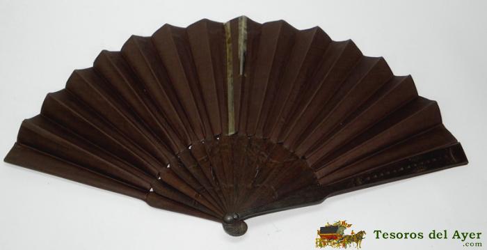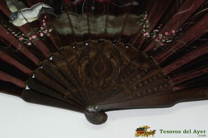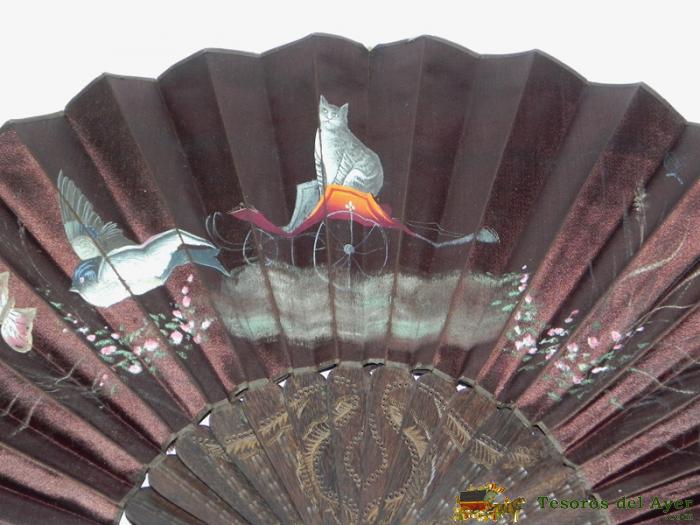 ABANICO DE MADERA Y TELA PINTADA, CON MOTIVO DE MARIPOSAS, PAJARO Y GATO PINTADOS, MIDEN LAS VARILLAS 27 CMS. DE LONGITUD, BUEN ESTADO.