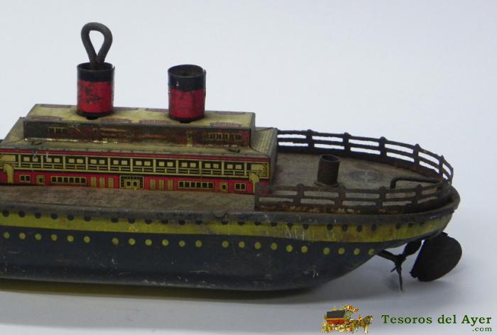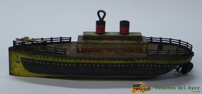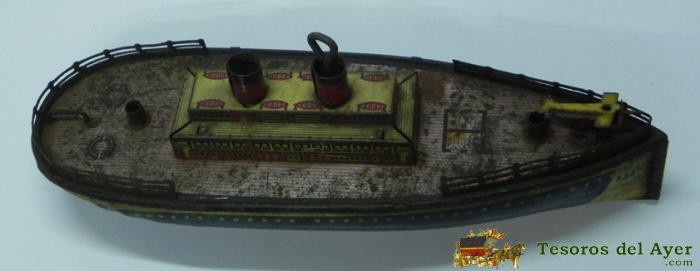 ANTIGUO BARCO PORTAAVIONES, REALIZADO EN HOJALATA LITOGRAFIADA, FUNCIONAMIENTO A CUERDA, FUNCIONANDO, DESCONOCEMOS LA MARCA, REGULAR ESTADO DE CONSERVACION, CAJA 2.