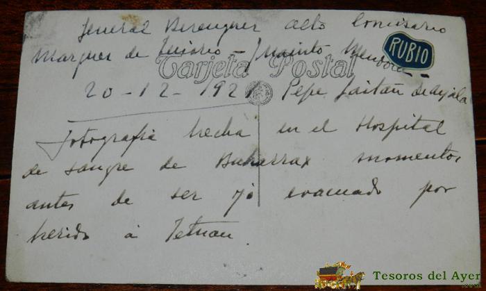 ANTIGUA FOTOGRAFIA DEL GENERAL BERENGUER, JUNTO CON REGULARES Y OTROS OFICIALES, FOTO RUBIO, CEUTA, GUERRA DEL RIF, ESCRITA POR EL REVERSO DESDE EL HOSPITAL DE SANGRE DE BUCHARRAX EN 1921, TAMAÑO POSTAL.