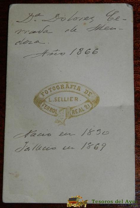 ANTIGUA FOTOGRAFIA ALBUMINA, TIPO CDV, FOTO DE L. SELLIER, FERROL, ESCRITA POR EL REVERSO EN 1866, MIDE 10,5 X 6 CMS.