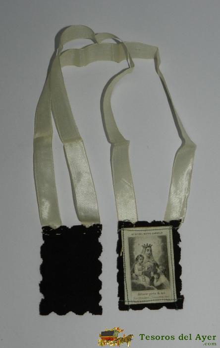 ANTIGUO ESCAPULARIO, DE NUESTRA SEÑORA DEL MONTE CARMELO, MIDE CADA CUADRO 8,5 X 7 CMS. EN TELA.