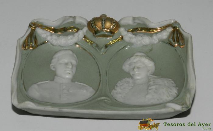 ANTIGUA BANDEJITA DE BISCUIT CON ALFONSO XIII Y LA REINA VICTORIA EUGENIA CON MOTIVO DE SU BODA 31 DE MAYO DE 1906, EXCELENTE ESTADO DE CONSERVACION, MIDE 12,5 X 9,5 CMS. MUY RARO DE ENCONTRAR.