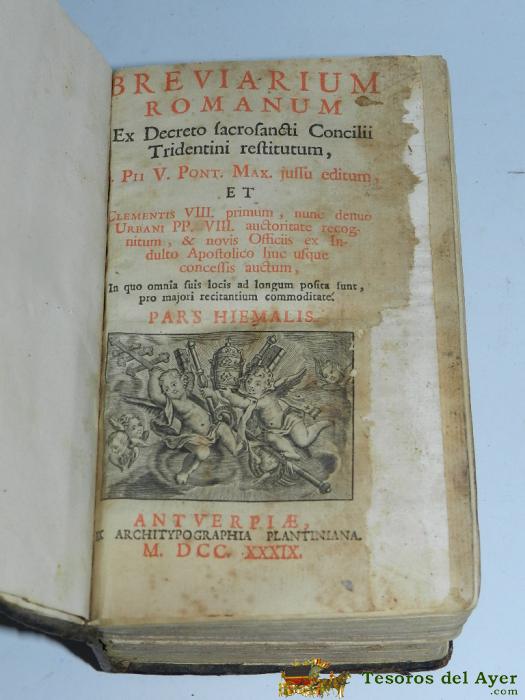 ANTIGUO BREVIARIUM ROMANUM + PROPRIUM SANCTORUM HISPANORUM AÑO 1739 Y 1741 RESPECTIVAMENTE, PORTADA Y TODO EL LIBRO A DOS TINTAS, CON VARIOS GRABADOS A TODA PAGINA, EX ARCHITYPOGRAPHIA PLANTINIANA, BUEN ESTADO GENERAL, PRECIOSA ENCUADERNACION, PERO LOMO Y