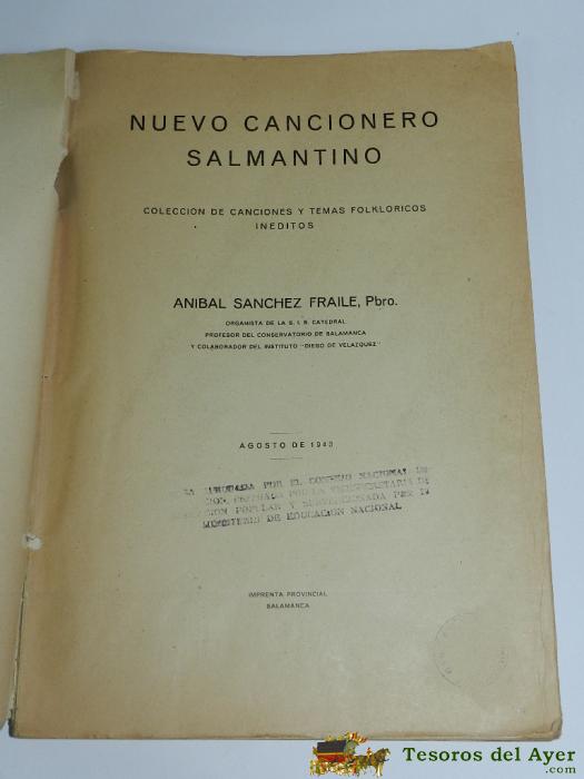 NUEVO CANCIONERO SALMANTINO. SALAMANCA, POR ANIBAL SANCHEZ FRAILE (PBRO.), IMPRENTA PROVINCIAL, 1943. 265 PP. MIDE 29 X 21 CM. MUY RARO E INTERESANTE.