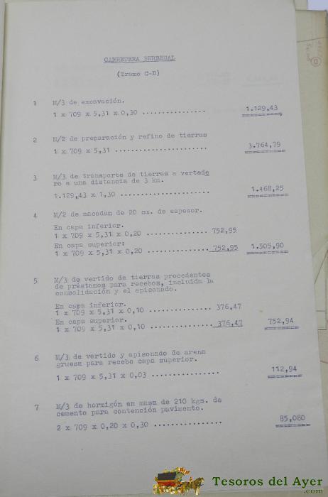 MINISTERIO DE AGRICULTURA, SERVICIO NACIONAL DEL TRIGO, RED NACIONAL DE SILOS, PRESUPUESTO DE ARREGLO DE LA CARRETERA DE ACCESO A BERBEGAL - HUESCA, PROYECTOS Y CONSTRUCCIONES, GRAN PLANO DESPLEGABLE 160 X 52 CMS. + 7 HOJAS DE LA MEMORIA.