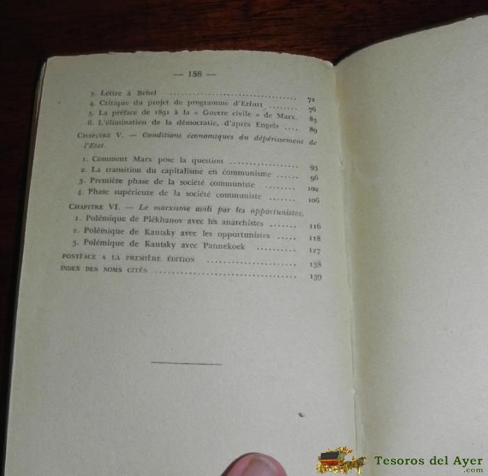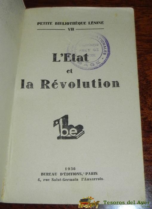 LIBRO GUERRA CIVIL - 1936 - L´ETAT ET LA REVOLUTION, PETITIE BIBLIOTHEQUE LENINE, BUREA E´EDITIONS PARIS, 158 PAGINAS, MIDE 17 X 11 CMS. ESTE LIBRO ESTABA DENTRO DE UNA COLECCION DE MANUALES ORIGINALES DE LA GUERRA CIVIL ESPAÑOLA, SEGURAMENTE QUE FUE UTILIZADO POR EL BANDO REPUBLICANO.