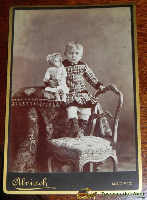 FOTOGRAFIA ALBUMINA DE NIÑA CON MUÑECA DE PORCELANA DE BOCA CERRADA, FINALES DEL SIGLO XIX PRINCIPIOS DEL XX, FOTOGRAFIA DE M. ALVIACH, PUERTA DEL SOL 14 DE MADRID, EXCELENTE, MIDE 16 X 11 CMS.