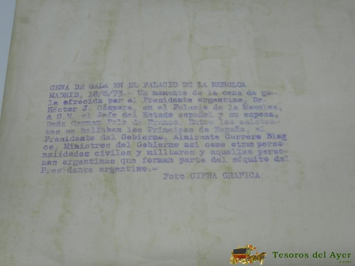 FOTOGRAFIA DE PRENSA DECENA DE GALA EN EL PALACIO DE LA MONCLOA, 18-6-1973, CENA DE GALA OFRECIDA POR EL PRESIDENTE ARGENTINO,ENTRE LOS ASISTENTES FRANCISCO FRANCO Y LOS PRINCIPES DE ESPAÑA, MIDE 24 X 18 CMS.