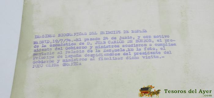 FOTOGRAFIA DE PRENSA19 DE JULIO 1974, ONOMASTICA DE D. JUAN CARLOS DE BORBON EN EL PALACIO DE LA ZARZUELA, PRESIDENTE DEL GOBIERNO Y MINISTROS, MIDE 24 X 18 CMS.