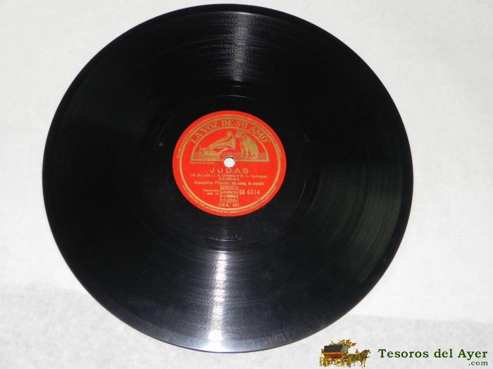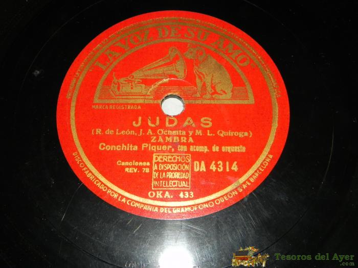 ANTIGUO DISCO DE PIZARRA DE 78 RPM - CONCHITA PIQUER CON ORQUESTA - JUDAS / COPLAS DE PEDRO ROMERO - LA VOZ DE SU AMO DA 4314 - OKA 432 / 433 .