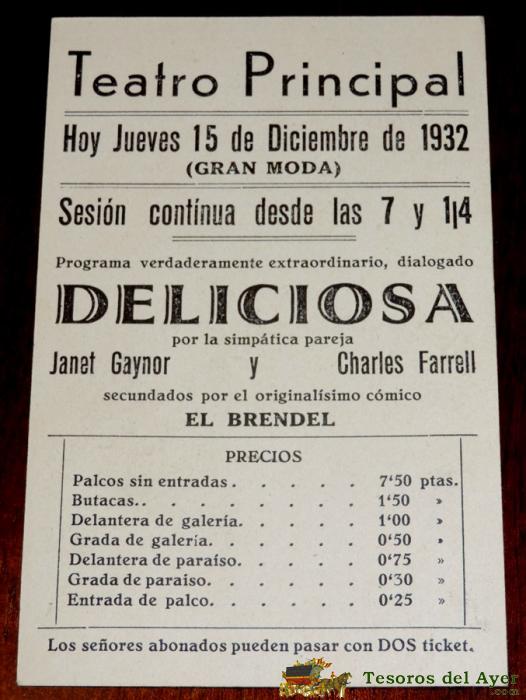 DELICIOSA, CON JANET GAYNOR Y CHARLES FARRELL, PROGRAMA SENCILLO DE CARTULINA, CON PUBLICIDAD DEL TEATRO PRINCIPAL , AÑO 1932.