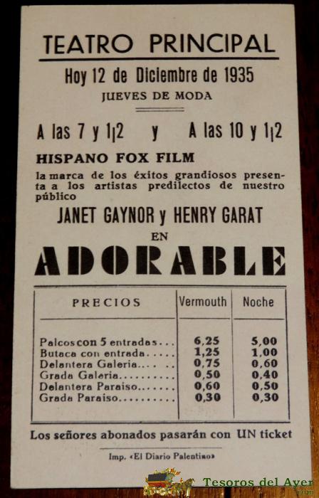 ADORABLE, PROGRAMA DE MANO EN CARTULINA, FOX - CON PUBLICIDAD DEL TEATRO PRINCIPAL 1935. JANET GAYNOR Y HENRY GARAT, CON PUBLICIDAD