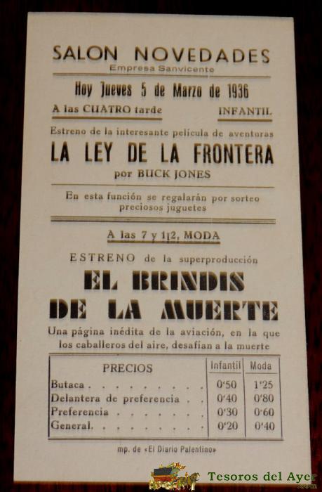 EL BRINDIS DE LA MUERTE, PROGRAMA DE MANO EN CARTULINA, FOX - CON PUBLICIDAD DEL SALON NOVEDADES.