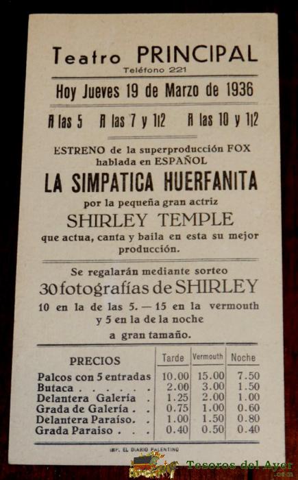 LA SIMPATICA HUERFANITA, PROGRAMA DE MANO EN CARTULINA, FOX - CON SHIRLEY TEMPLE, CON PUBLICIDAD DEL TEATRO PEINCIPAL 1936. PALENCIA.