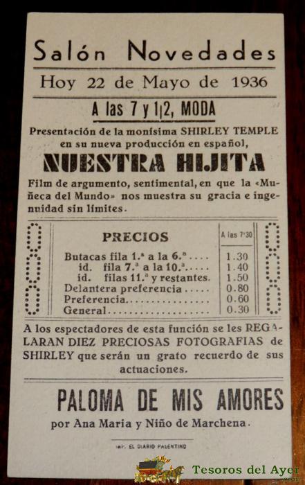 NUESTRA HIJITA, PROGRAMA DE MANO EN CARTULINA, FOX - CON SHIRLEY TEMPLE, CON PUBLICIDAD DEL SALON NOVEDADES 1936. PALENCIA.