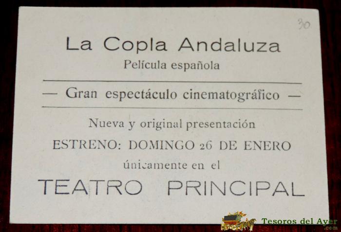 LA COPLA ANDALUZA, TARJETA DE CARTULINA, MIDE 12 X 9 CMS. CON PUBLICIDAD DEL TEATRO PRINCIPAL ESTRENO.