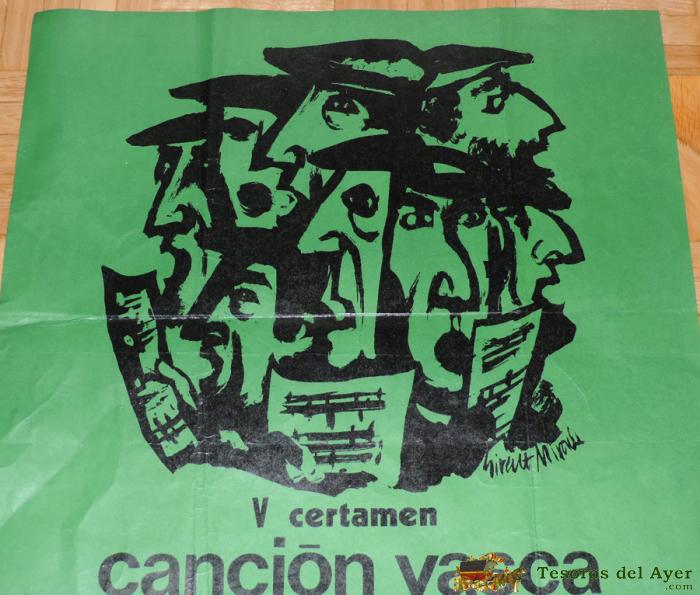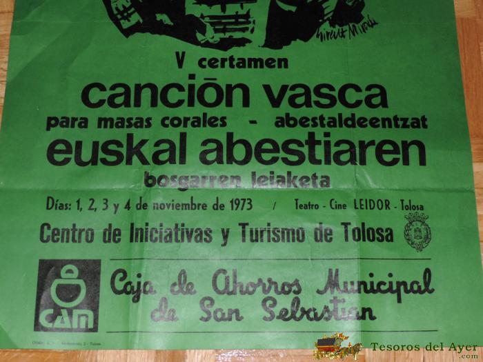 1973 CARTEL V CERTAMEN CANCION VASCA, PARA MASAS CORALES, EUSKAL ABESTIAREN, TEATRO CINE LEIDOR DE TOLOSA, MIDE 70 X 48,5 CMS. TAL COMO SE VE EN LAS FOTOGRAFIAS PUESTAS.