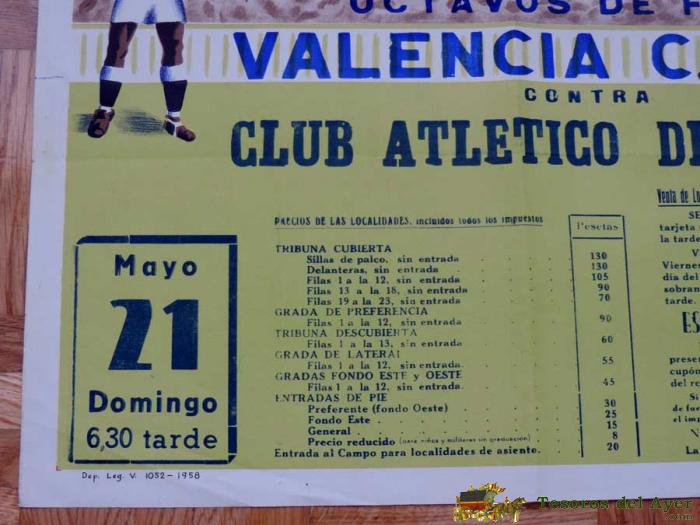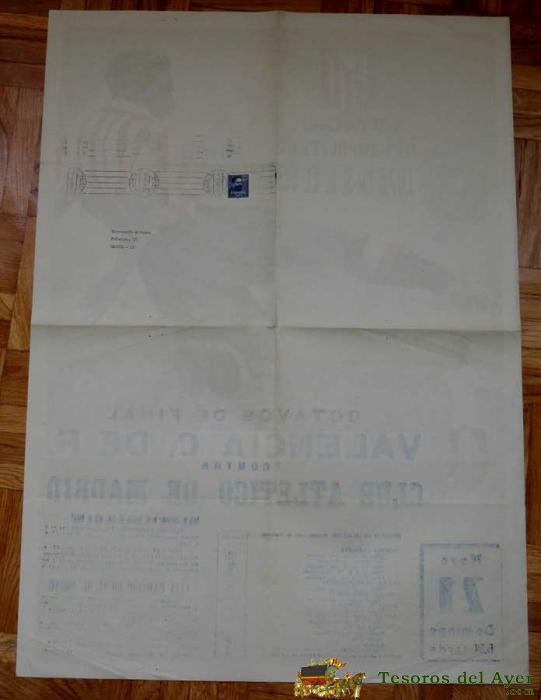 1961, CARTEL ORIGINAL ATLETICO DE MADRID, VALENCIA C. DE F., FUTBOL, COPA DE S.E. EL GENERALISIMO, OCTAVOS DE FINAL, - 21 DE MAYO DE 1961 - ESTADIO METROPOLITANO - MIDE 70 X 50 CMS - LIT. ORTEGA S.A., RARISIMO, PIEZA DE MUSEO.