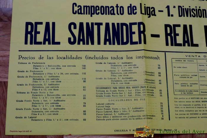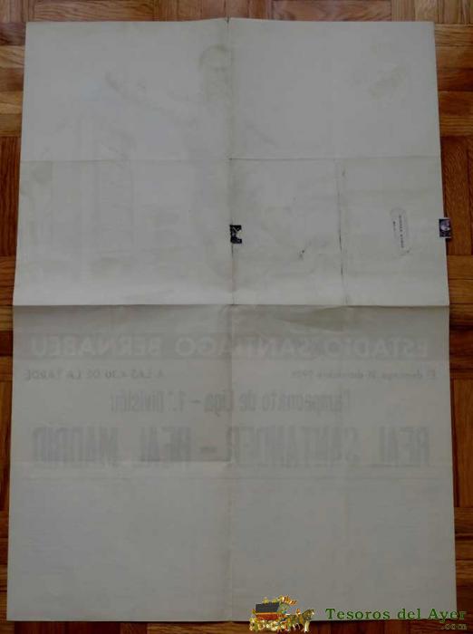1961, CARTEL ORIGINAL REAL MADRID, REAL SANTANDER, CAMPEONATO DE LIGA 1ª DIVISION, 31 DE DICIEMBRE DE 1961, ALTAMIRA S.A., ESTADIO SANTIAGO BERNABEU - MIDE 70 X 50 CMS - RARISIMO, PIEZA DE MUSEO.